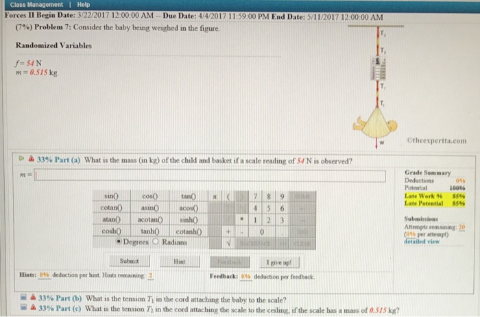 C What the tension T n the cord attaching the scale to the ceiling N this work. C What is the tension T2 in the cord attaching the scale to the ceiling if the scale has a mass of 0500 kg. For this problem on the topic of dynamics we have shown a scale that is being used to a a baby in the figure And we want to know the mass of the child and basket.