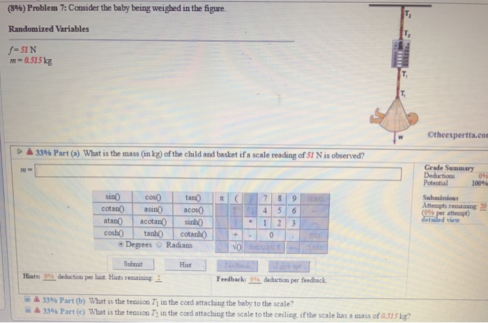 C What is the tension in the cord attaching the scale to the ceiling if the scale has a mass of 0500 kg. And this weight is mass times acceleration due to gravity. B What is the tension T1 in the cord attaching the baby to the scale.