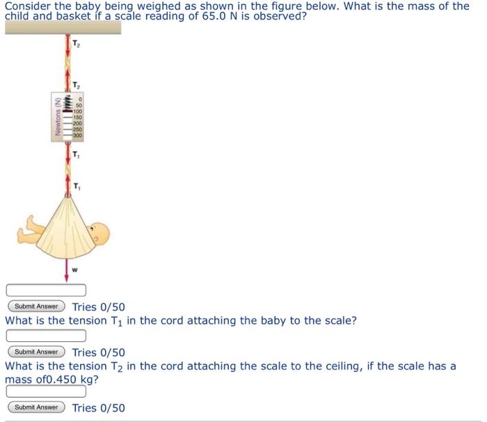 Consider the baby being weighed in the figure. And so thats why we can say. B What is the tension Ti in the cord attaching the baby to the scale. C What is the tension T2 in the cord attaching the scale to the ceiling if the scale has a mass of 0500 kg.
