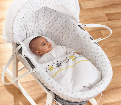 This darling moses basket comes complete with a beautiful eyelet bumper and sheet. Eyelet Fitted Baby Moses Basket. Made with top quality grey wicker accompanied by handles for easy transportation the 4Baby moses basket is lightweight easy to carry and comes complete with safety mattress co-ordinating hood quilt and a padded liner for increased comfort and security.